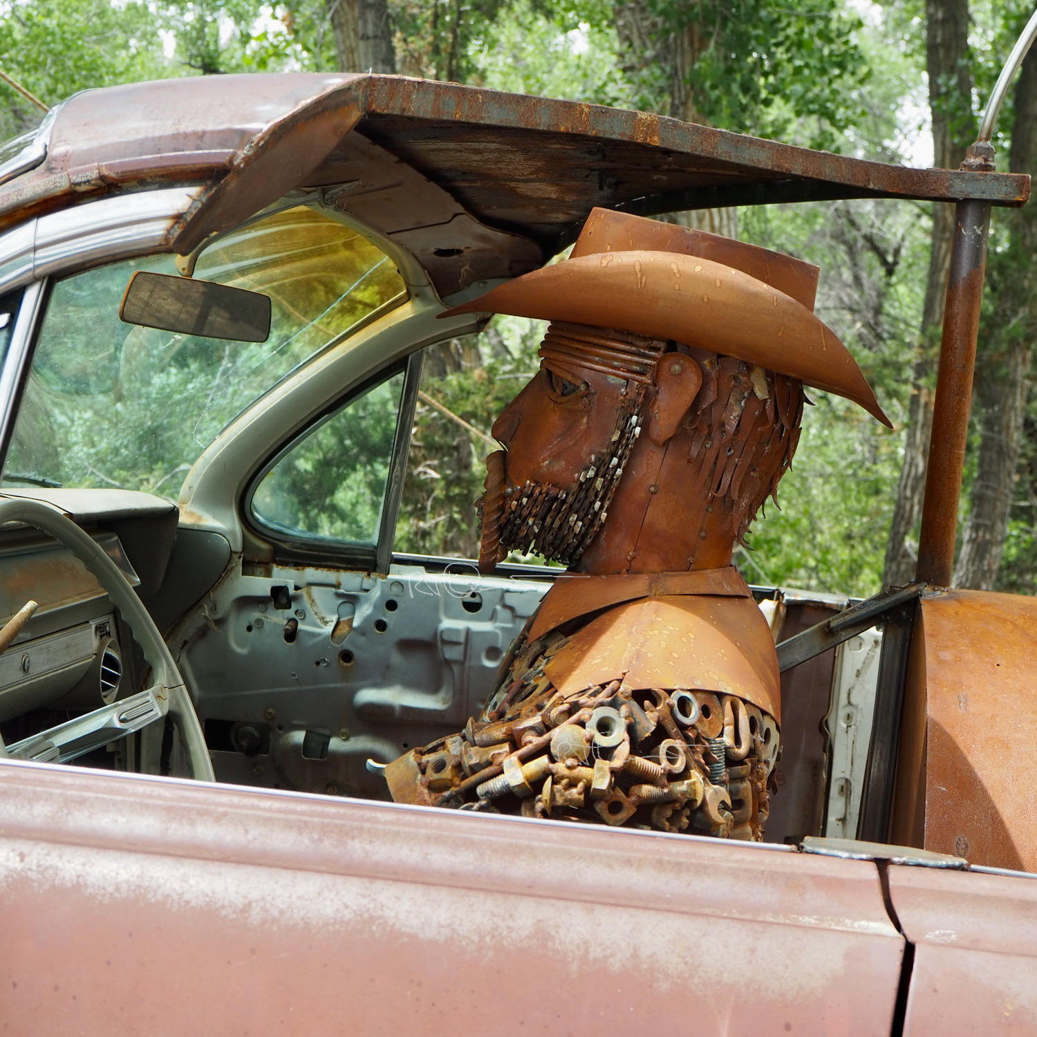 Robert T Davis, “Bob”, is an all-around artist. He builds large kinetic metal sculptures; spins the wool from his sheep and weaves with the yarn; makes linoleum block prints, and makes hand-stamped, tin frames for those prints; paints in acrylic and oils; and designs and builds furniture. Read more about the artist, and follow his work in progress.